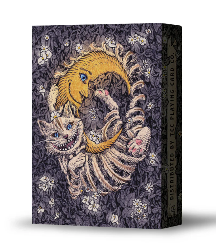Las cartas de se encuentran a medio camino entre formas vivientes y figuras geométricas inanimadas—entre la vida y la muerte. Incluso los palos multicolores parecen brillar en las caras de las cartas. El reverso de las cartas, inquietante, presenta calaveras flotantes poligonales, un recordatorio del destino que nos espera a todos—¡y de aprovechar el día mientras podamos!